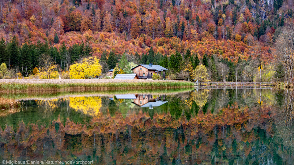 Zu fünft trafen wir uns an der Klause am Almsee. Es war ein grauer Tag, mit Wolken, ein bisschen Regen und Hochnebel – aber wie heißt es so schön: Es gibt kein schlechtes Wetter zum Fotografieren. Wir spazierten gemütlich zu der Bucht, wo das Fernrohr steht, hielten hier und da an und schossen ein paar Fotos. Das Wasser war teilweise ganz glatt und ruhig, und die wunderbaren Farben der Blätter in Rot, Gelb und Braun spiegelten sich im See. Eine herrliche Herbststimmung konnten wir einfangen.