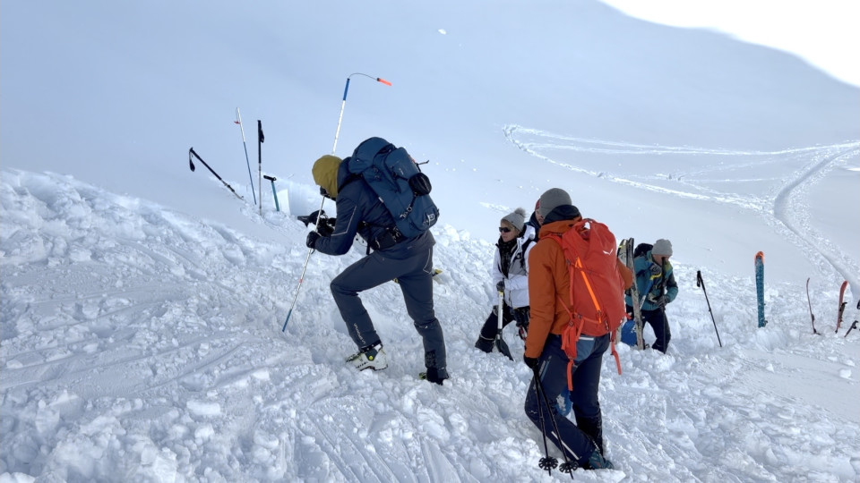 Bei strahlendem Sonnenschein und knackigen -10 °C war das LVS-Training ein voller Erfolg. Die Teilnehmer*innen lernten den richtigen Umgang mit LVS-Gerät, Sonde und Schaufel für den Ernstfall. Ein unangekündigtes Szenario mit zwei verschütteten Personen bildete den spannenden Höhepunkt der Ausbildung.