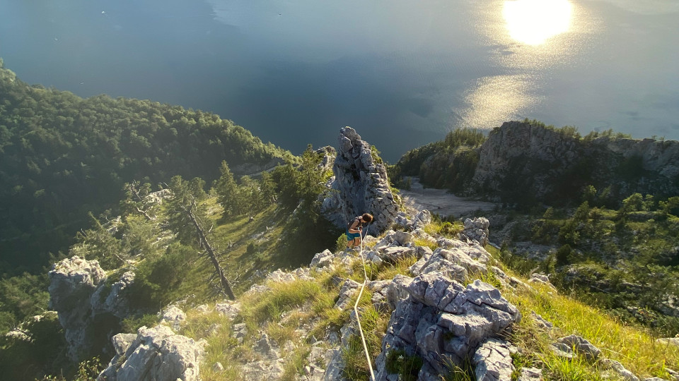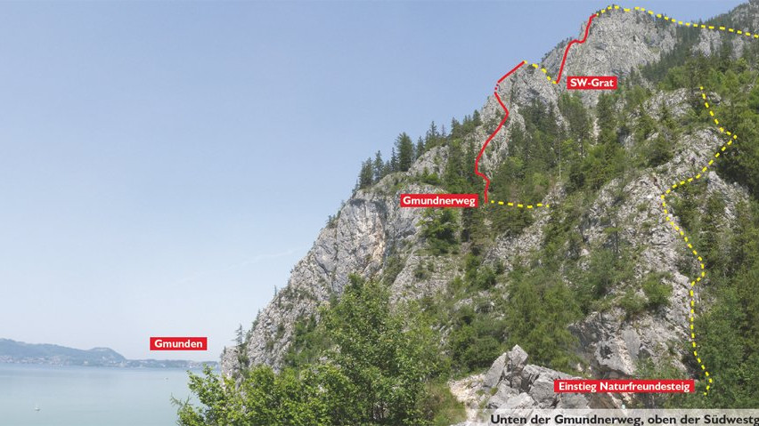 Wir klettern die Kombination Gmundnerweg und Südwestgrat – eine sehr lohnende, luftige Gratkletterei auf meist gutem Fels hoch über dem Traunsee.
